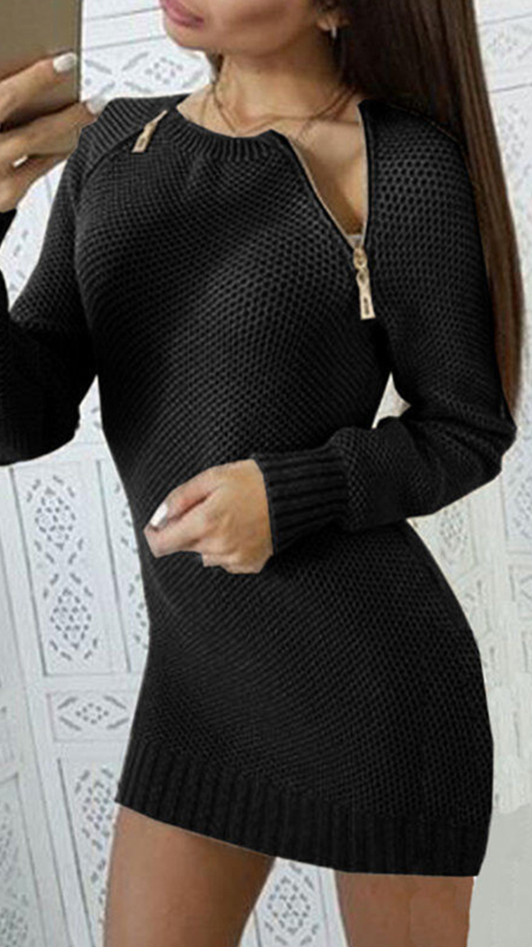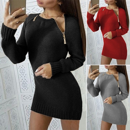 It is a good time to give your wardrobe a seasonal update by adding this sweater dress. It comes with a solid color,the oblique zipper design at the neckline part makes this piece look so chic and distinctive. Finished with long sleeve and a fit silhouette,this sweater dress not only can keep you warm,but also can exude your charm.