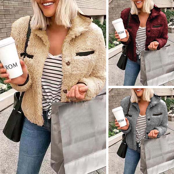 Fashion Solid Color Long Sleeve POLO Collar Plush Coat