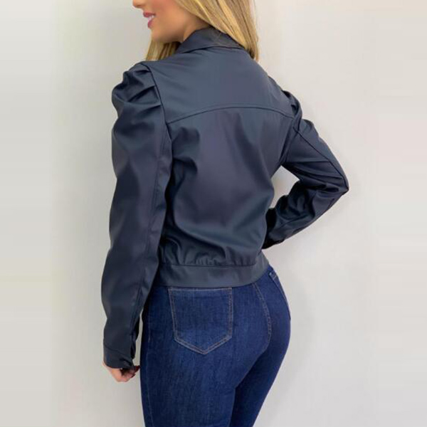 Fashion Solid Color Long Sleeve POLO Collar PU Leather Jacket