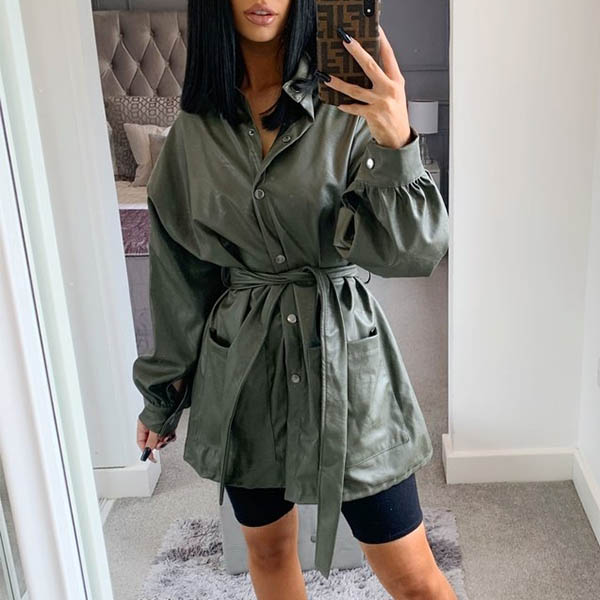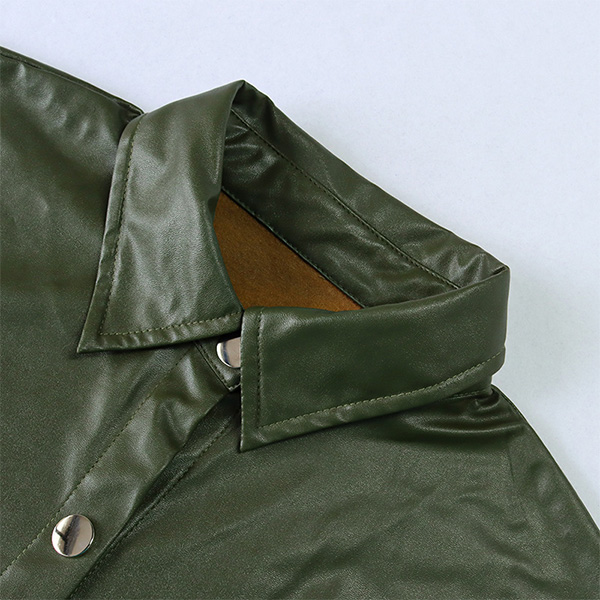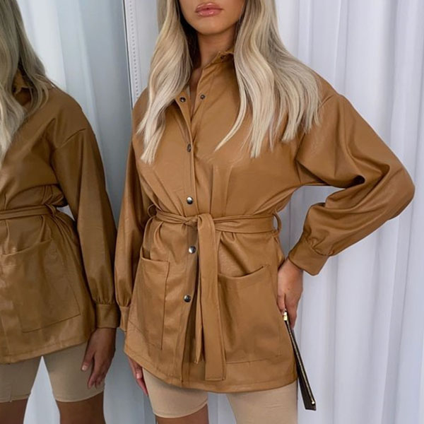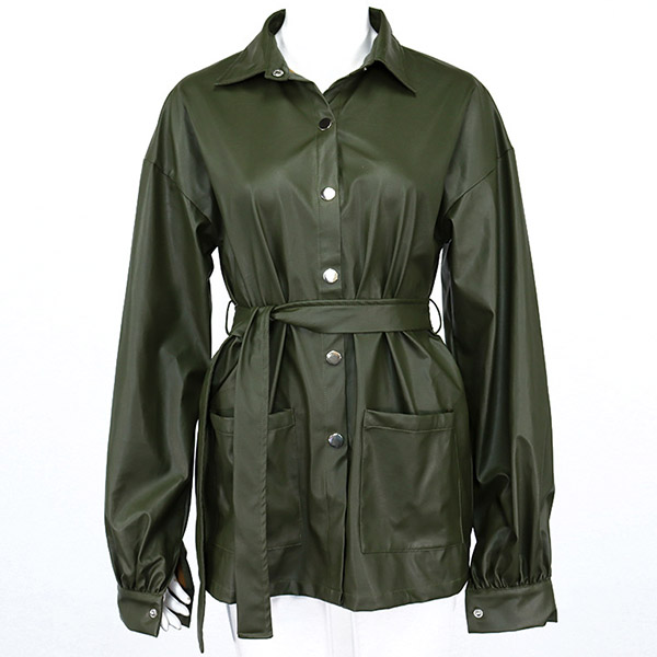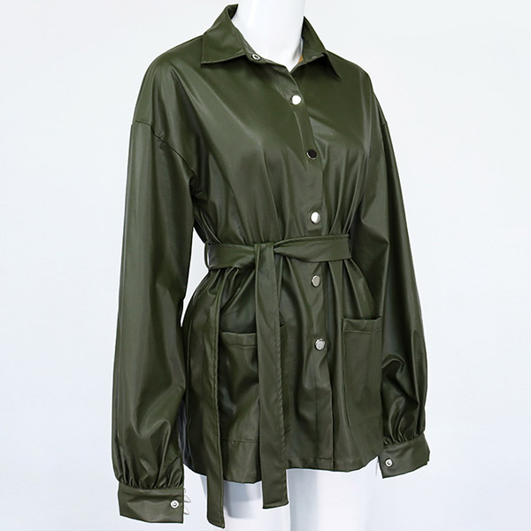 Fashion Solid Color Long Sleeve POLO Collar PU Leather Jacket with Waist Strap