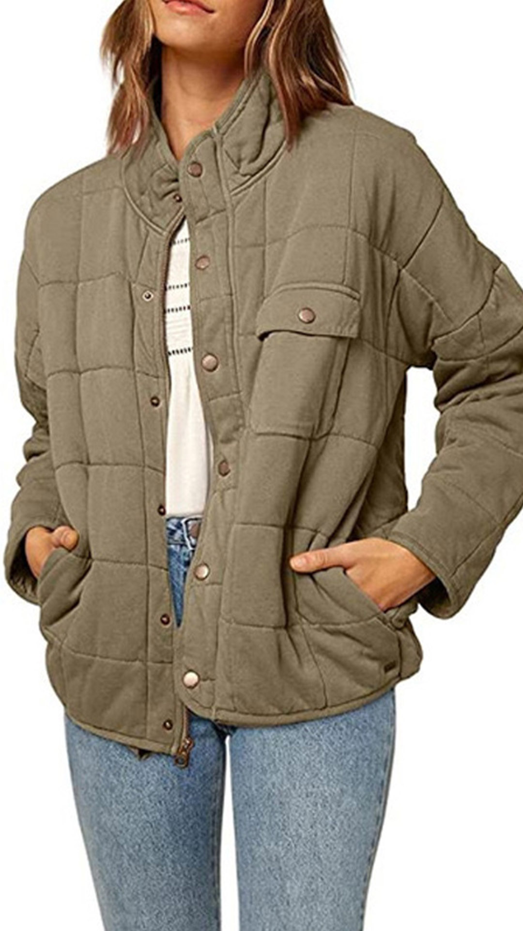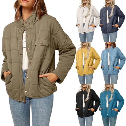 This fashionable jacket features a solid color design, long sleeves, and a quilted thin lightweight construction, creating a stylish and versatile outerwear piece. This jacket is perfect for creating a chic and polished look. Multi-colors avabile.