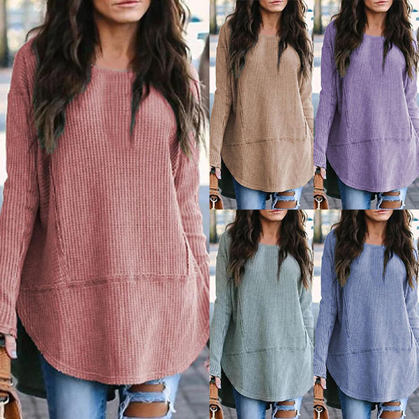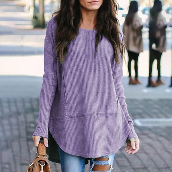 Fashion Solid Color Long Sleeve Round Neck Arc Hem T-shirt