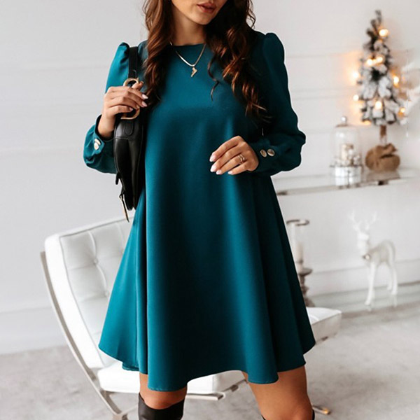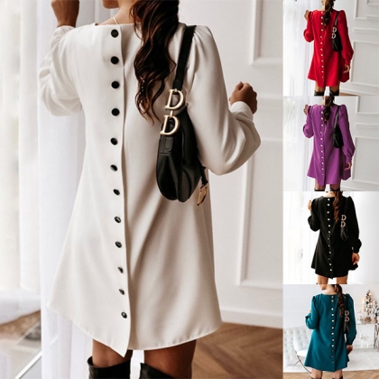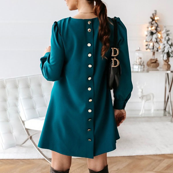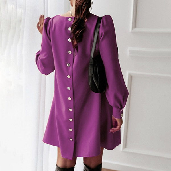 Fashion Solid Color Long Sleeve Round Neck Back-button Dress