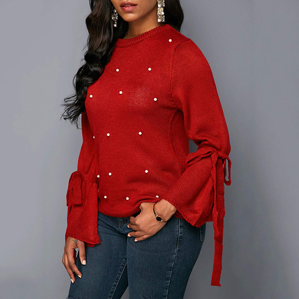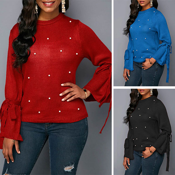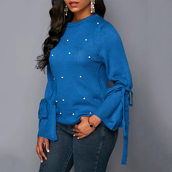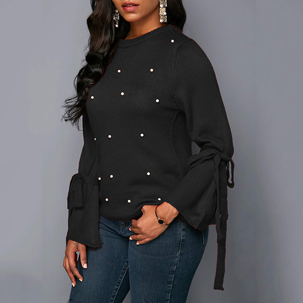 Fashion Solid Color Long Sleeve Round Neck Beaded Knit Top