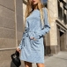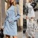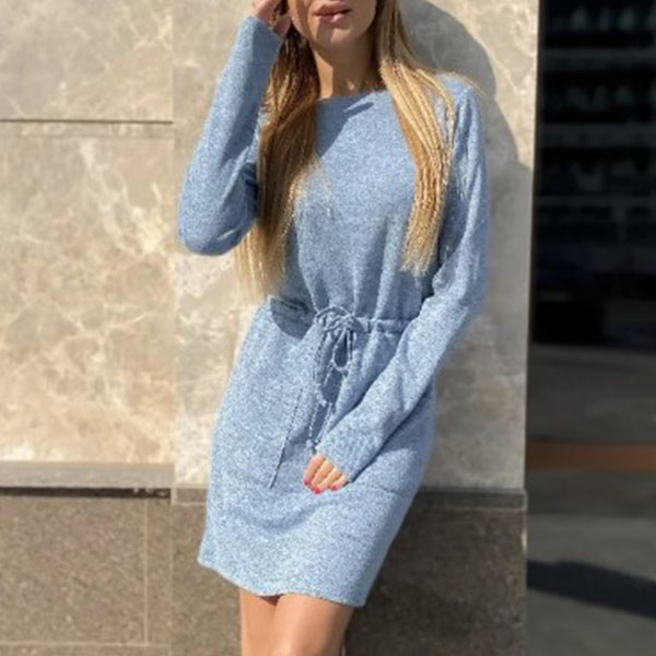 Fashion Solid Color Long Sleeve Round Neck Drawstring Waist Dress