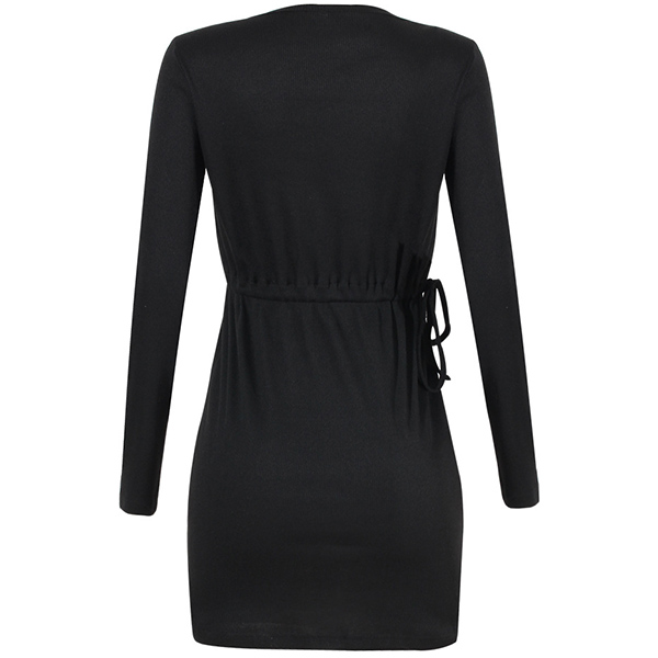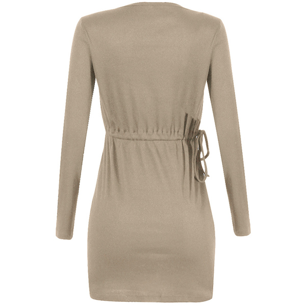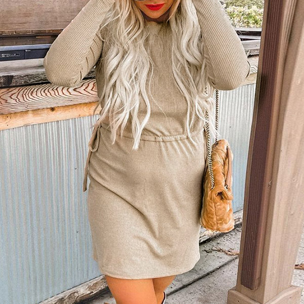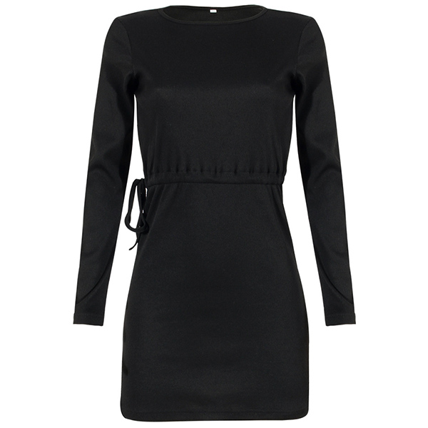 Fashion Solid Color Long Sleeve Round Neck Drawstring Waist Slim Fit Dress