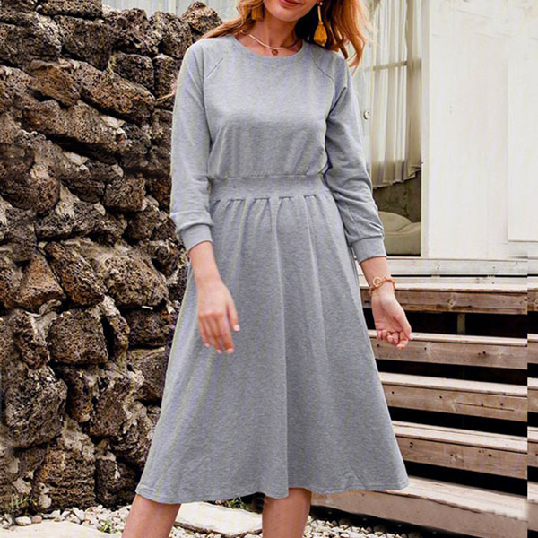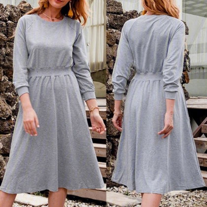 Fashion Solid Color Long Sleeve Round Neck High Waist Dress