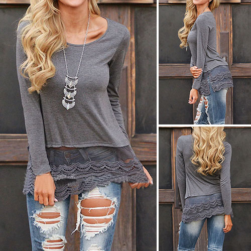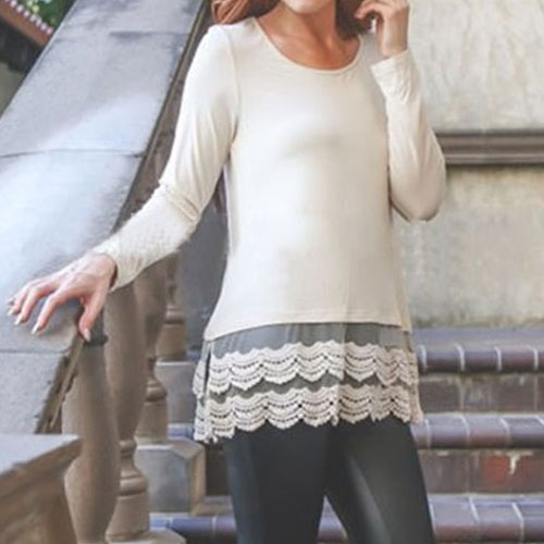 This t-shirt is crafted from soft and cozy fabric,with long sleeve,round neck and lace spliced hem design,
