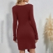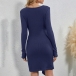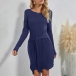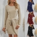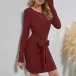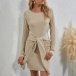 Fashion Solid Color Long Sleeve Round Neck Lace-up Knotted Slim Fit Dress