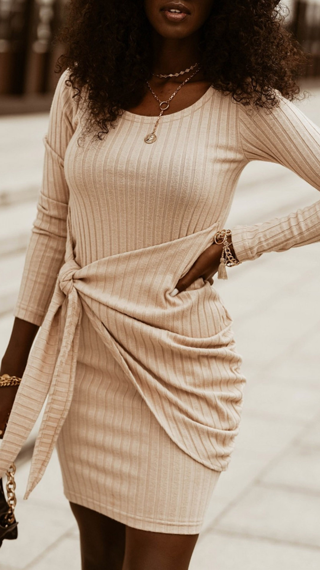 Fashion Solid Color Long Sleeve Round Neck Lace-up Slim Fit Dress