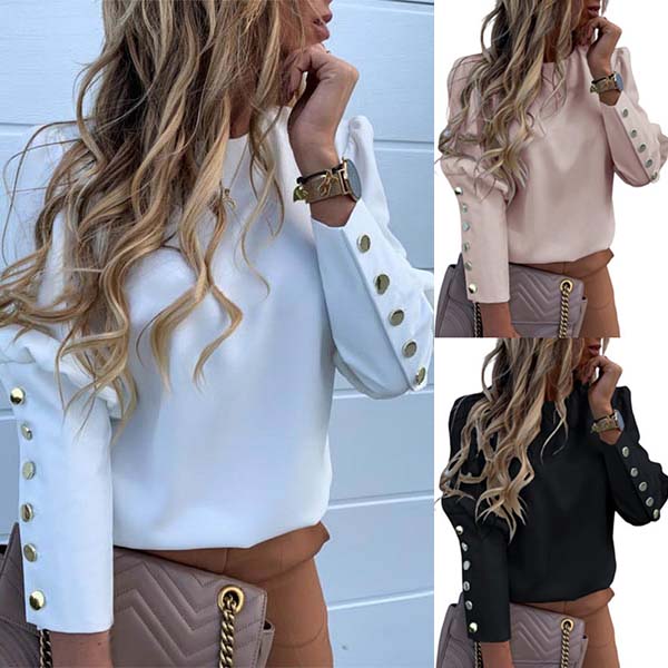 Hey,girls,you can easily boost your charm by wearing this wonderful top. Crafted in a solid color,with long sleeve and round neck design,this piece can give you a comfortable day with its soft and breathable fabric. What's more,the metal button details make this piece look more attractive. Attracted? Then invite it to your wardrobe!