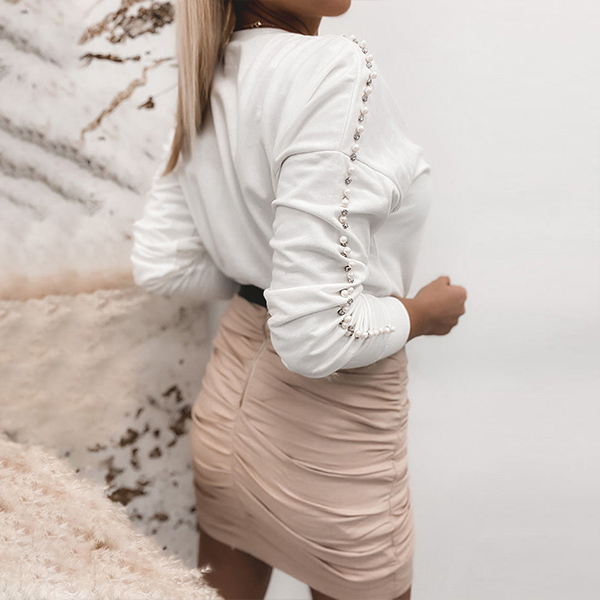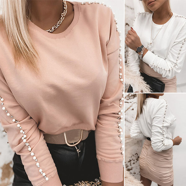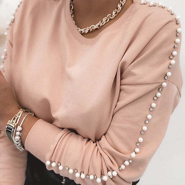 Fashion Solid Color Long Sleeve Round Neck Pearl Spliced T-shirt