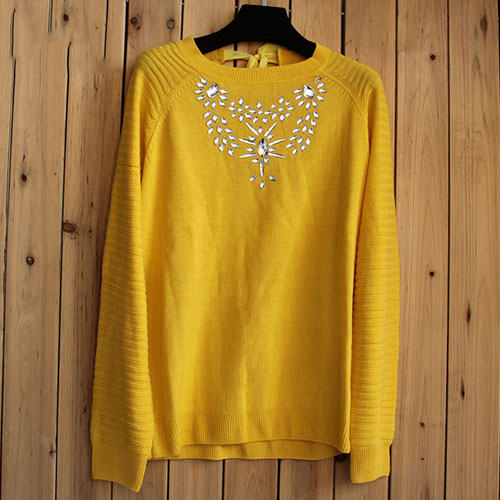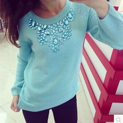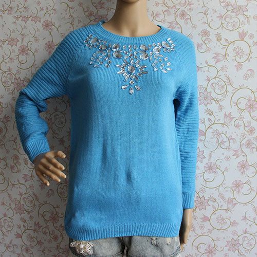 with long sleeve,round neck and backless design. What's more,its rhinestone for decoration