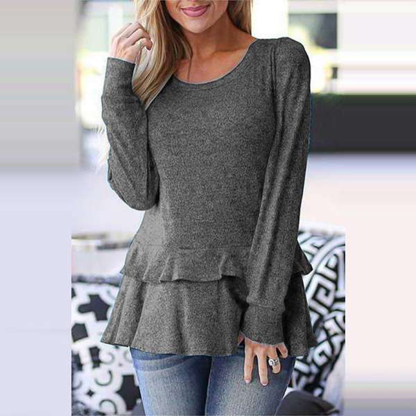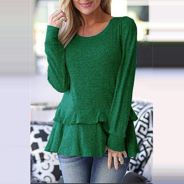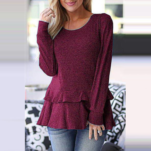 Fashion Solid Color Long Sleeve Round Neck Ruffle Hem T-shirt