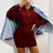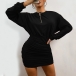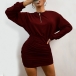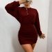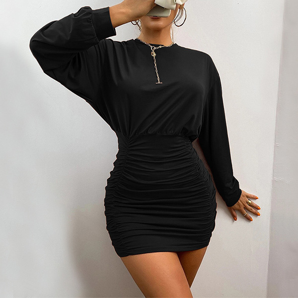 Fashion Solid Color Long Sleeve Round Neck Slim Fit Wrinkled Dress