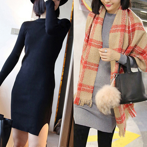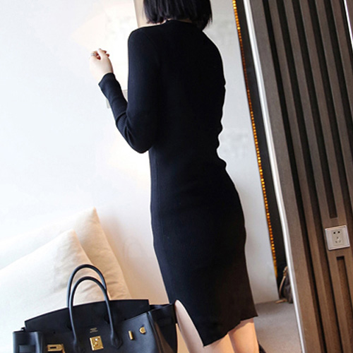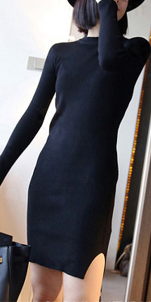 Fashion Solid Color Long Sleeve Round Neck Slit Hem Knit Dress