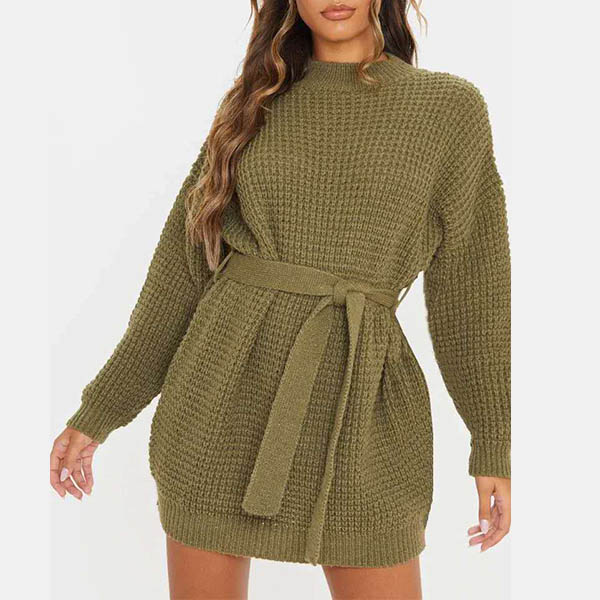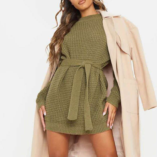 Fashion Solid Color Long Sleeve Round Neck Sweater Dress with Waist Strap