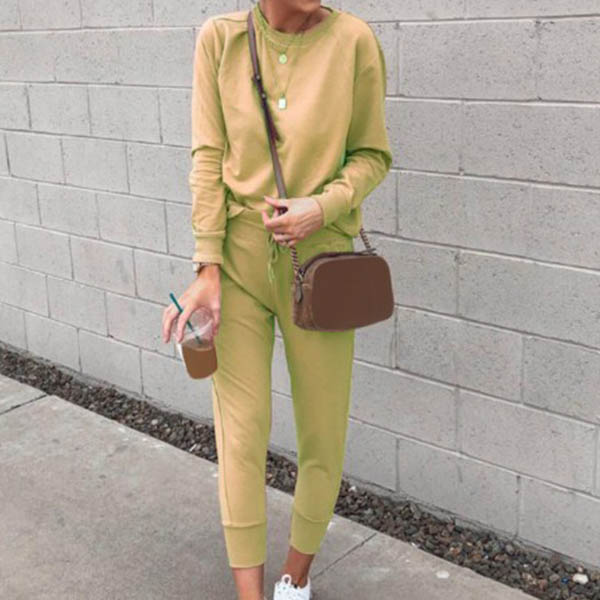 Fashion Solid Color Long Sleeve Round Neck Top + Pants Two-piece Set