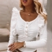 Round neckline, long sleeves with ruffle decoration, front button design for the gathering design. We suggest you matching with a high waist tight pants to have a wonderful day.
