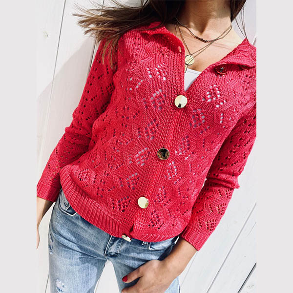This knit cardigan can give you a perfect transition from the summer days to the autumn days. Hollow out knit style makes this piece look so attractive,while the single-breasted design will further enhance its charm. Your perfect partner when you feel a little cold.