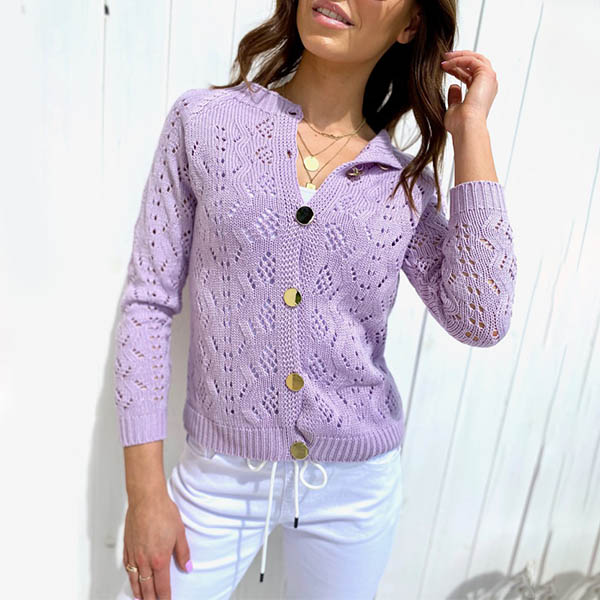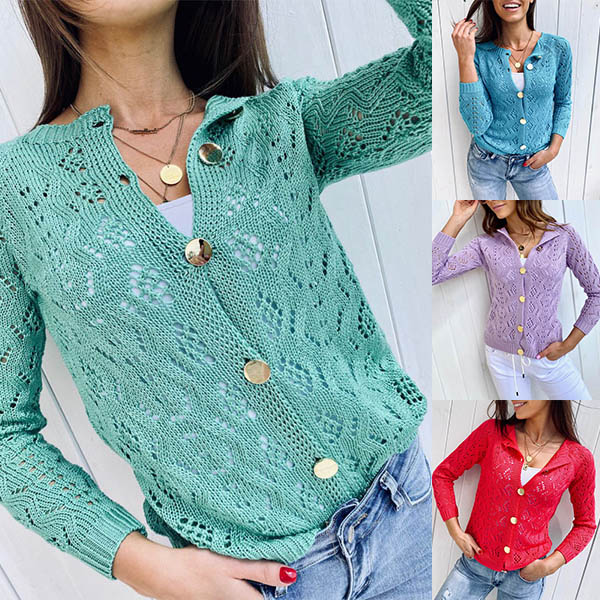 Fashion Solid Color Long Sleeve Single-breasted Hollow Out Knit Cardigan