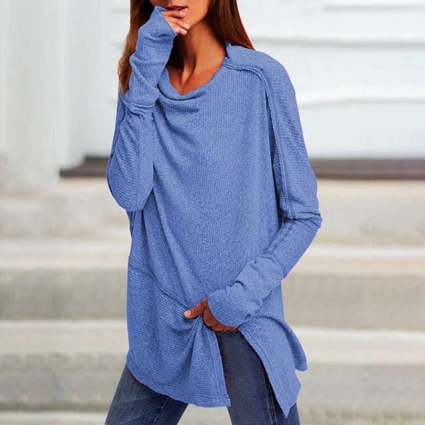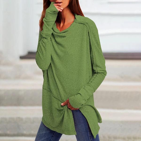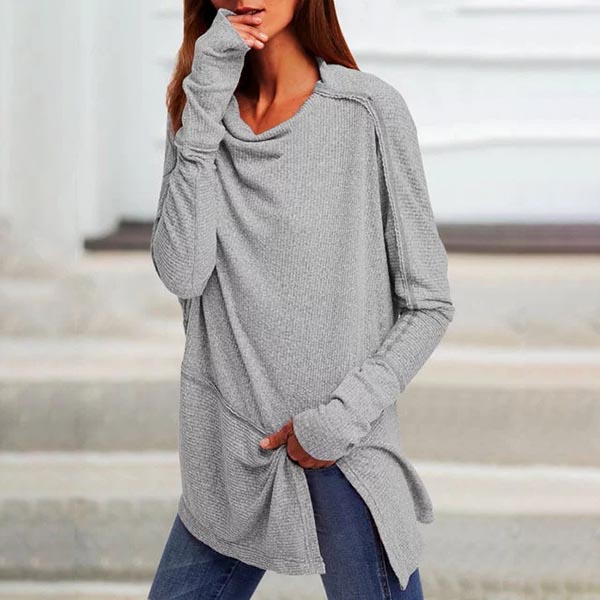 Fashion Solid Color Long Sleeve Slit Hem Loose T-shirt