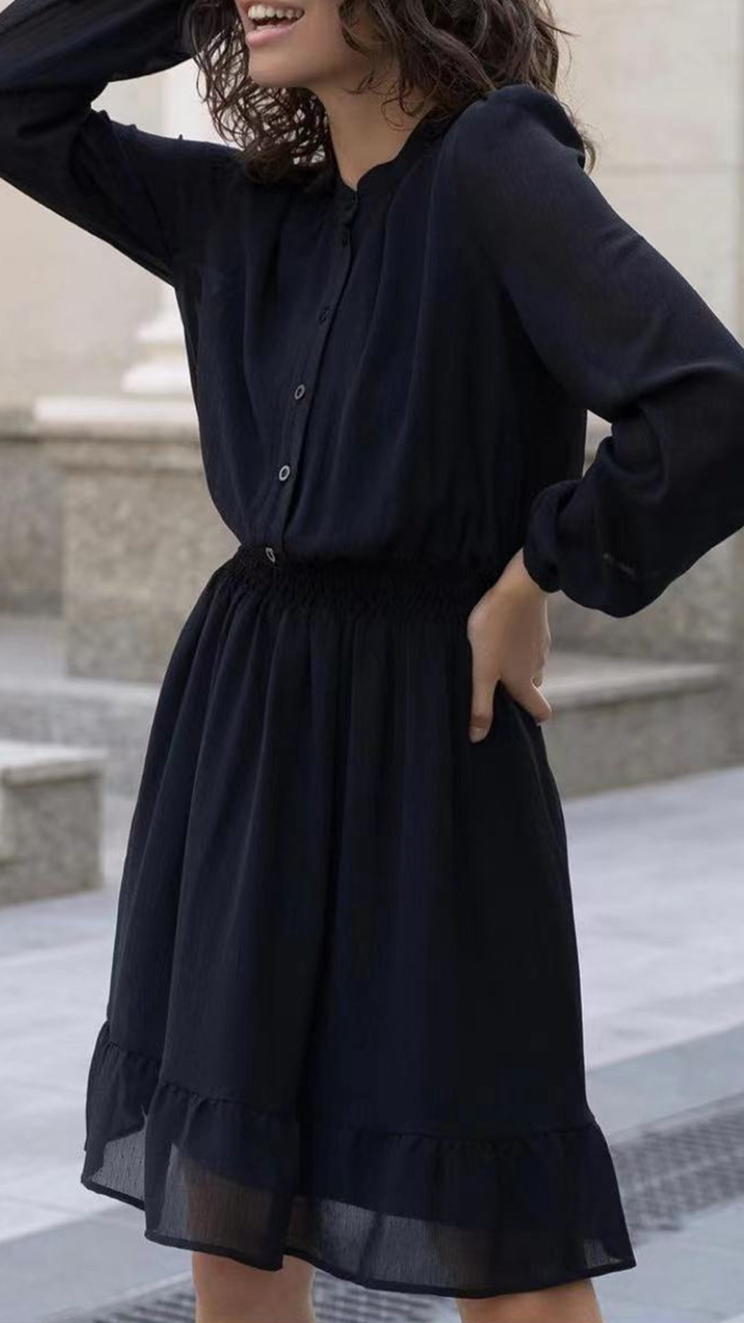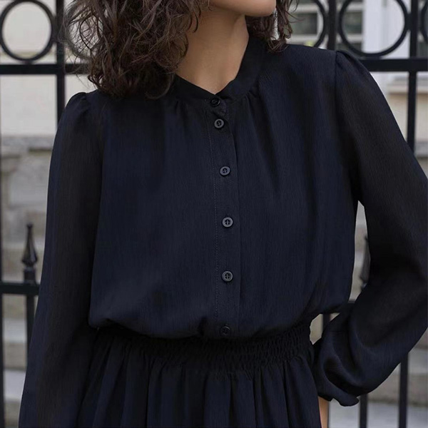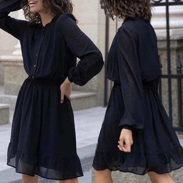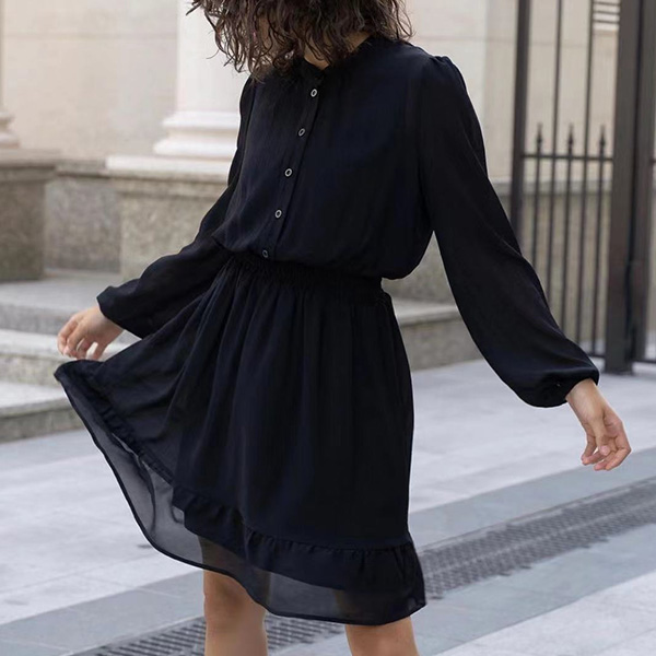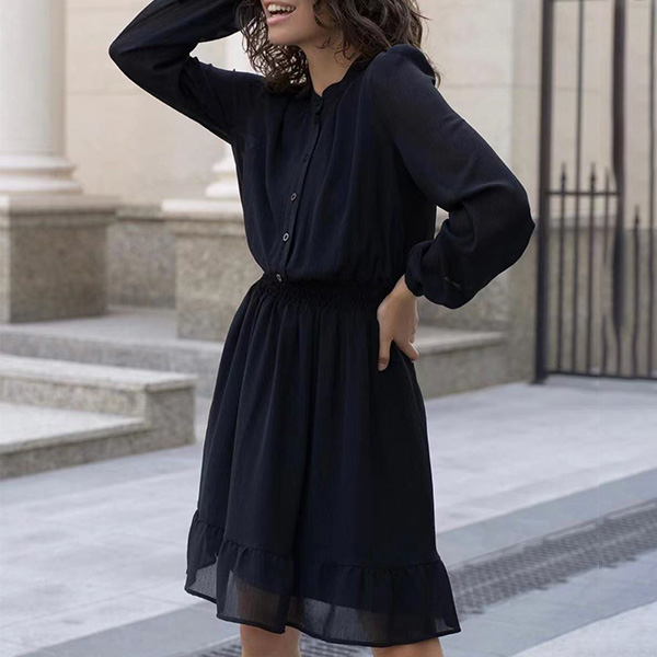 You have no need to worry about what to wear for your busy routines if you have this dress in your team. Boasts flattering black tone,with long sleeve,stand collar and elastic waist,this dress knows how to keep the comfy as well as exude your style,personality!