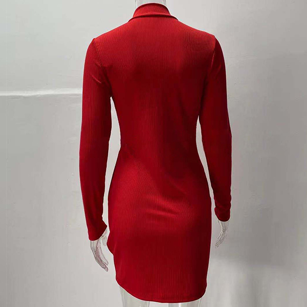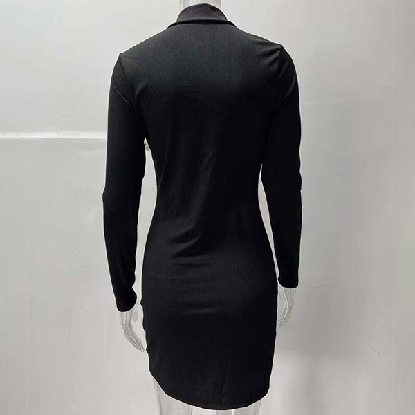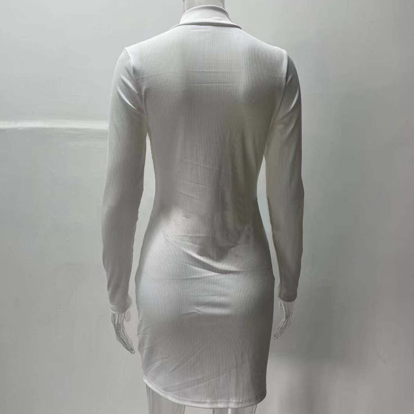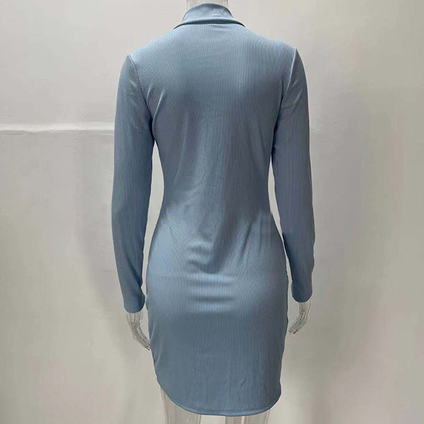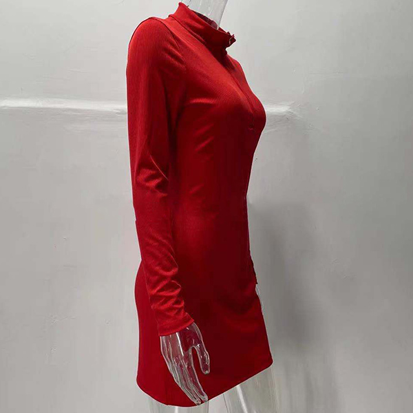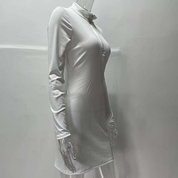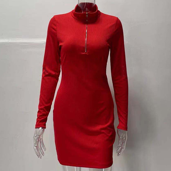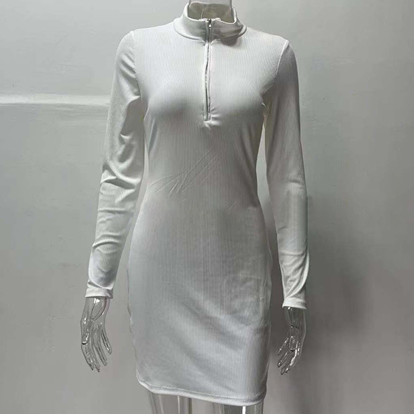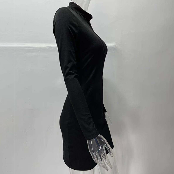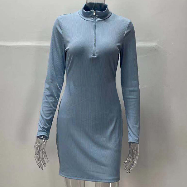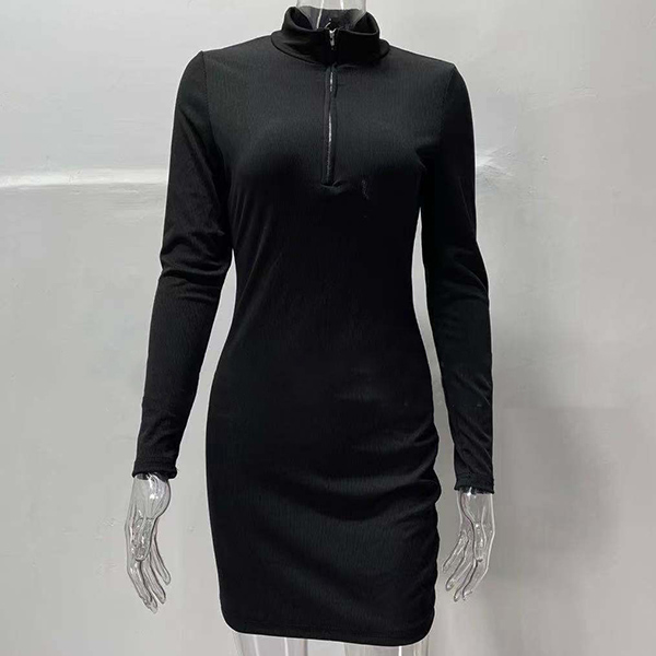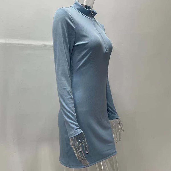 Fashion Solid Color Long Sleeve Stand Collar Front-zipper Slim Fit Dress