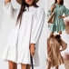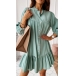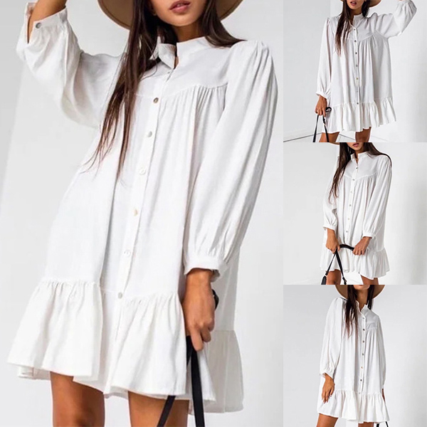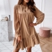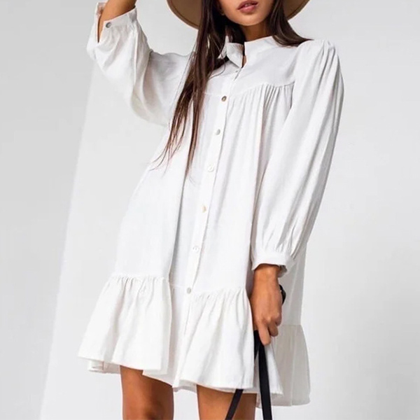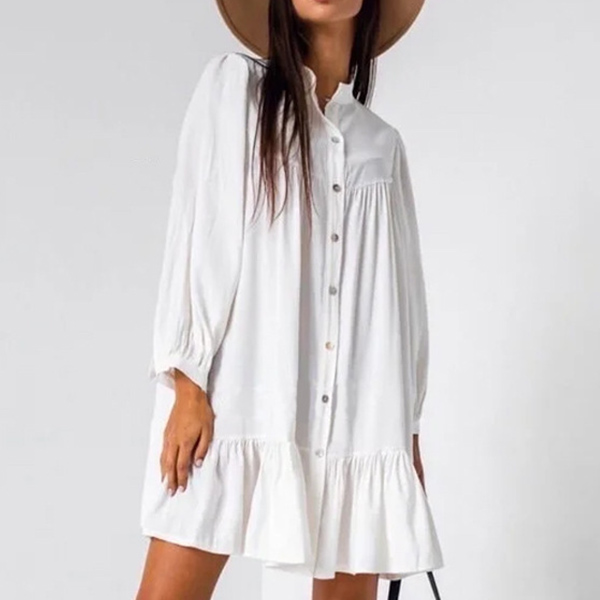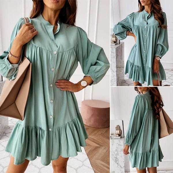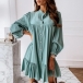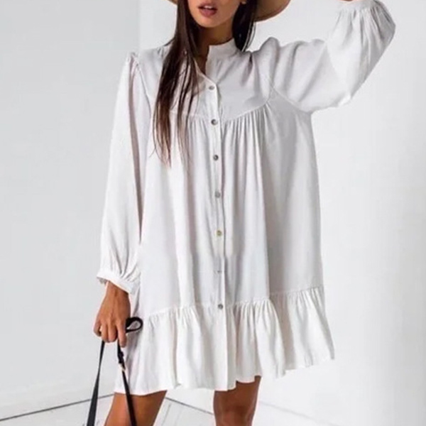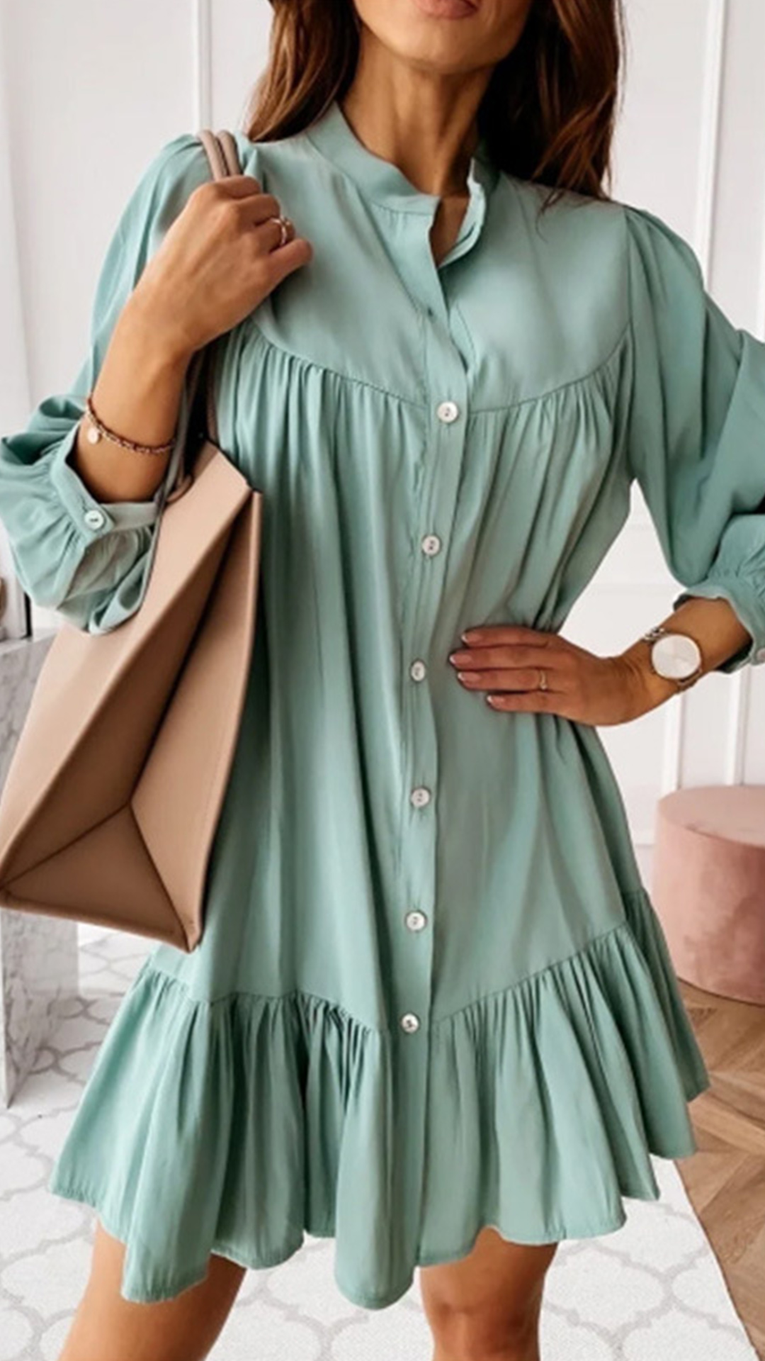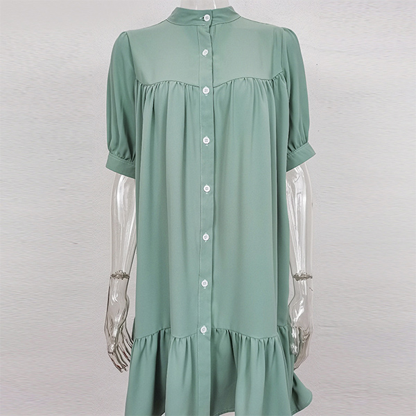 Fashion Solid Color Long Sleeve Stand Collar Ruffle Hem Single-breasted Loose Dress