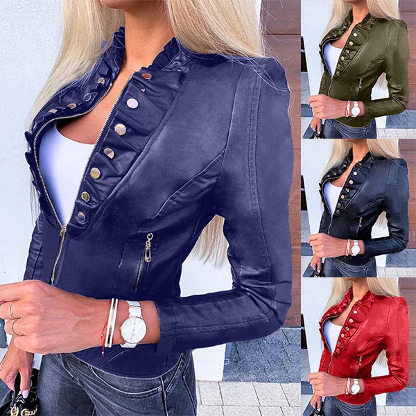 Fashion Solid Color Long Sleeve Stand Collar Slim Fit PU Leather Jacket