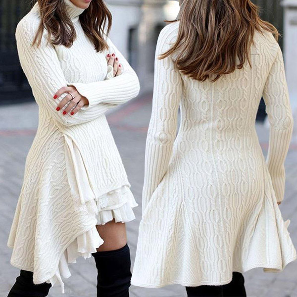 It is a good chance to give your daily style an update with this knit dress. Solid color style,the turtleneck design can keep your neck warm. What's more,the high-low hem design breaks the traditional and classic design style. Attracted? Then buy one! Perhaps you can add a sparkle necklace if you wanna look more beautiful.