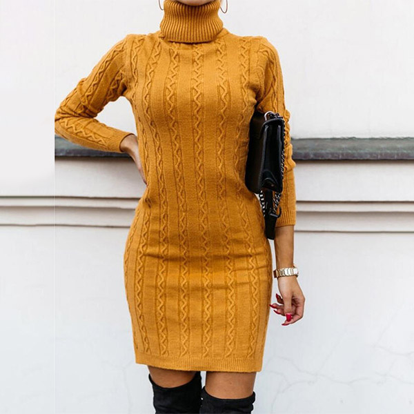 Fashion Solid Color Long Sleeve Turtleneck Slim Fit Sweater Dress