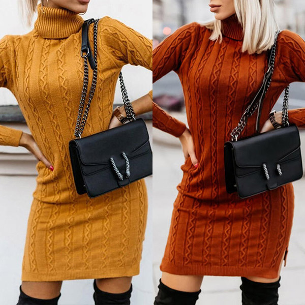 For your cold days,this sweater dress would be your wardrobe staple. The turtleneck design can keep you neck warm. Solid color style,finished with long sleeve and a fit silhouette,this sweater dress definitely can showcase your slender figure. You can wear it alone or match with your overcoats in these cold days.