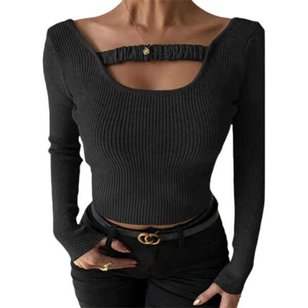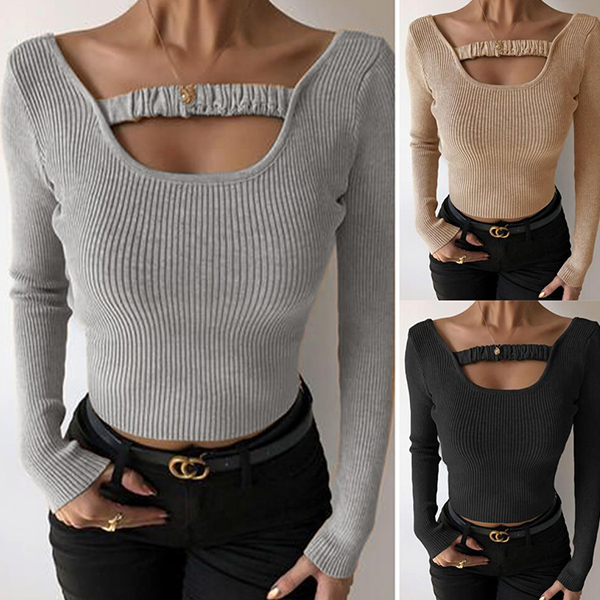 Fashion Solid Color Long Sleeve U-neck Slim Fit Knit Top