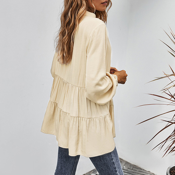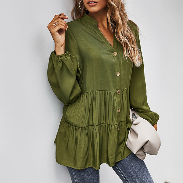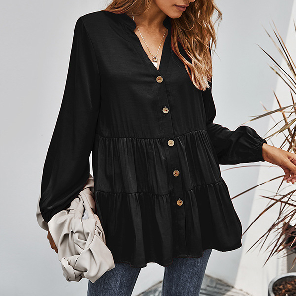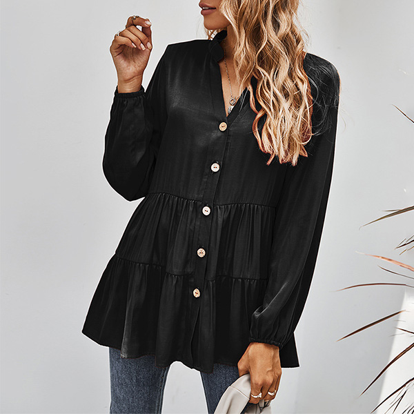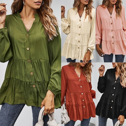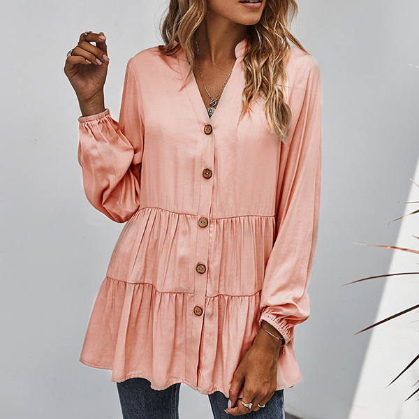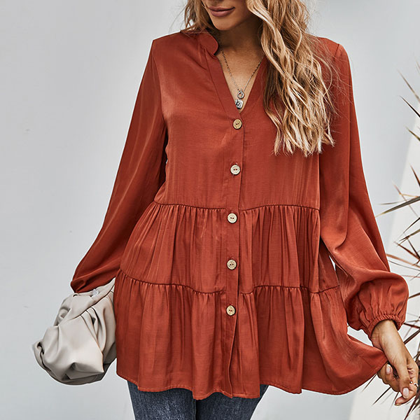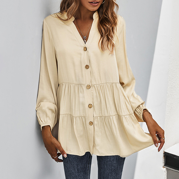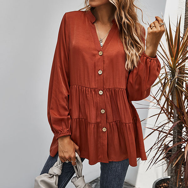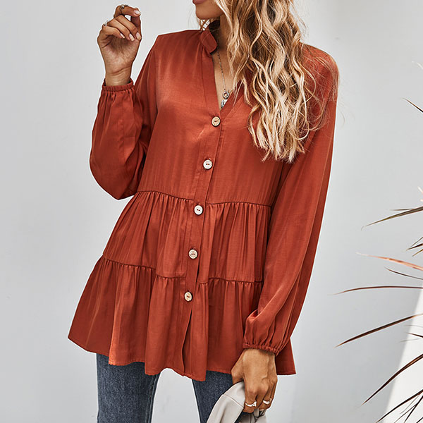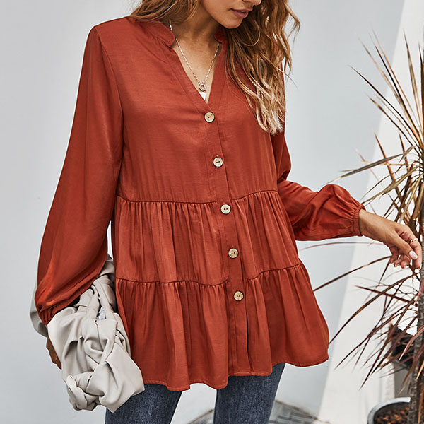 For a simple,delicate yet stylish working look,you can just have a try this blouse. It boasts a solid color,finished with long sleeve,v-neck and single-breasted design,this blouse can ensure you a comfortable day with its soft and breathable fabric. try to match with a jeans to start your wonderful day.