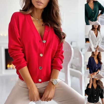 Fashion Solid Color Long Sleeve V-neck Front-button Cardigan