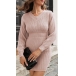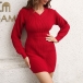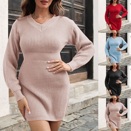 Fashion Solid Color Long Sleeve V-neck High Waist Bodycon Knitted Dress