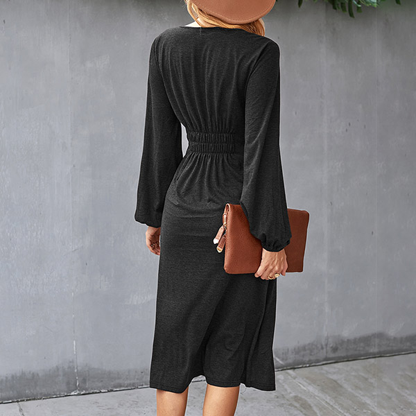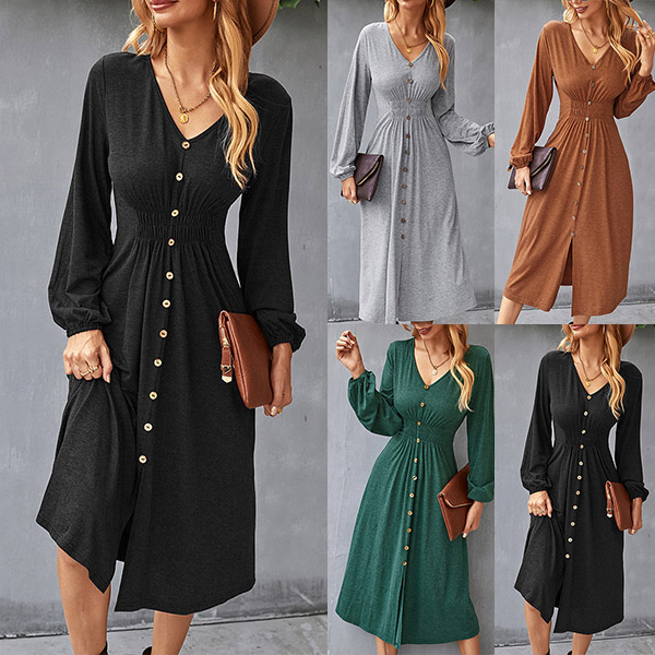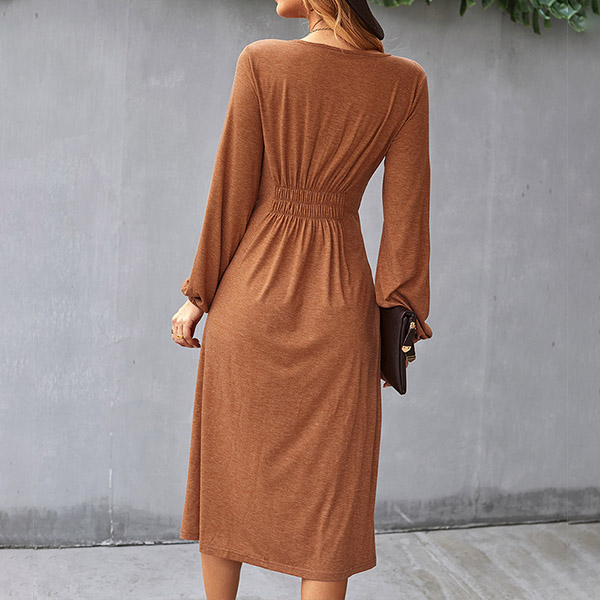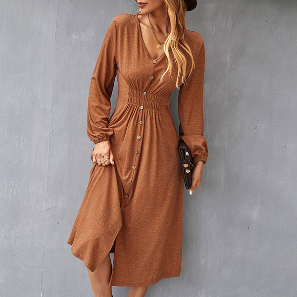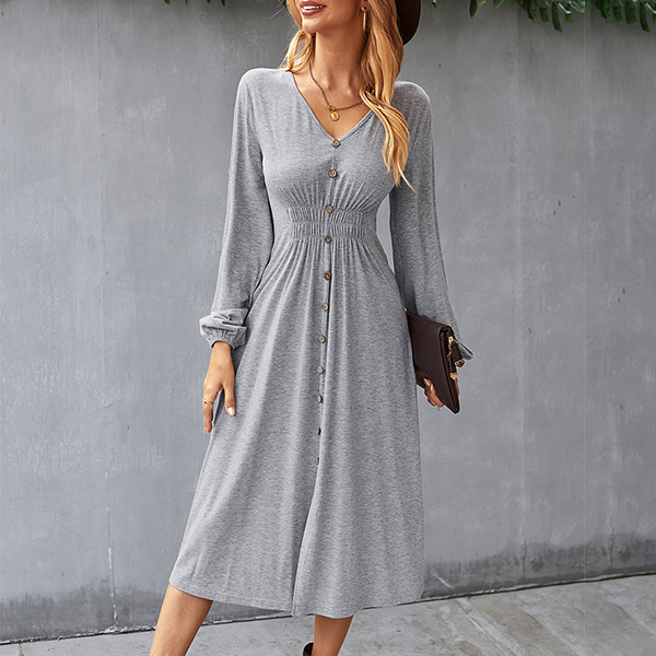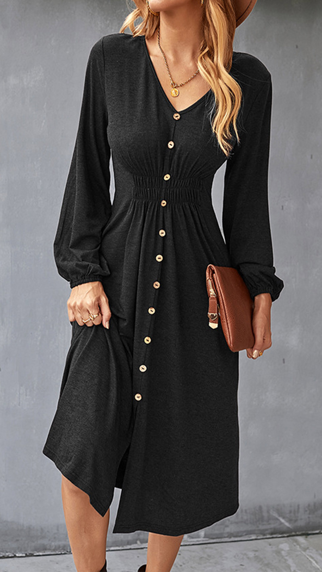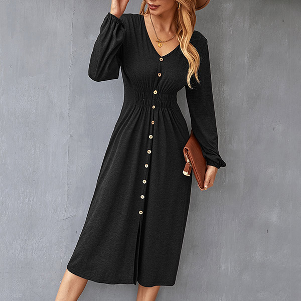 Fashion Solid Color Long Sleeve V-neck High Waist Front-button Dress