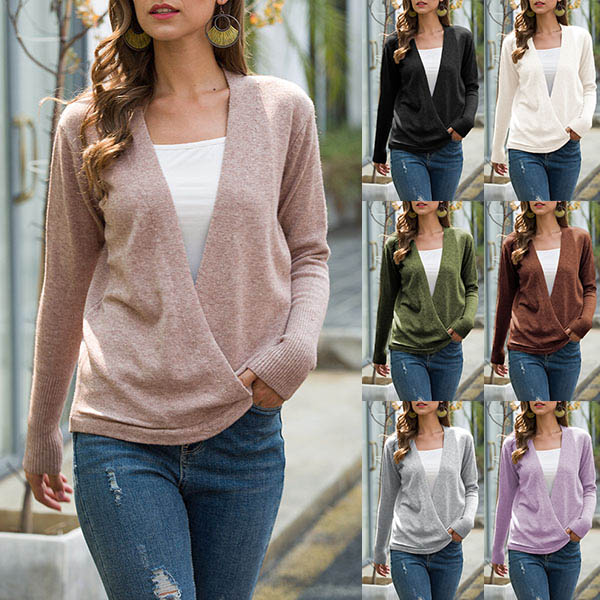 Fashion Solid Color Long Sleeve V-neck Knit Top