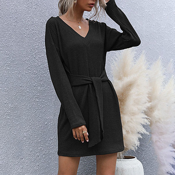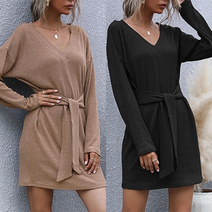 This dress that combines of cozy and stylish vibes is worth to have a place in your wardrobe. Boasts a solid color,finished with long sleeve and v-neck design,this dress knows how to give you a comfortable day with its soft and breathable fabric. And the lace-up design at the waist part can better showcase your figure. Like it? Then buy one!