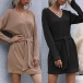 Fashion Solid Color Long Sleeve V-neck Lace-up Dress