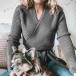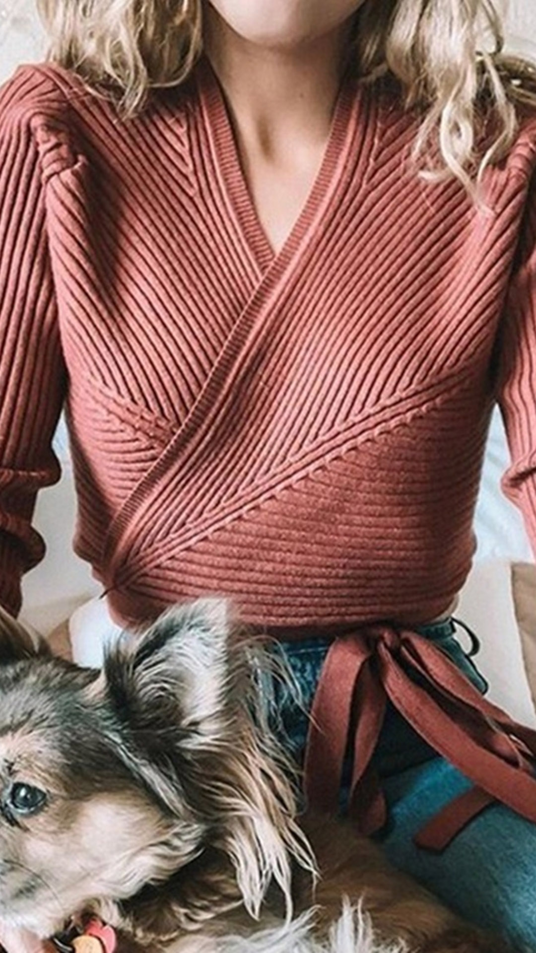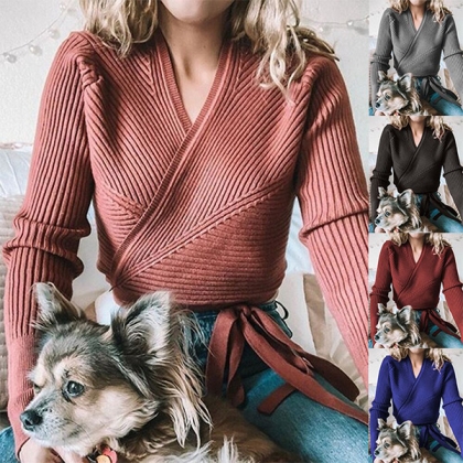 Combines of sassy and flirty sense,this knit crop top can easily arouse your attention. Solid color style,the v-neck and lace-up hem design will enhance its entire charm. Crafted from soft,cozy knitted fabric,this long sleeve crop top is a good chance to flaunt off your slender waistline. Perfect fit for matching with your high waist bottoms.