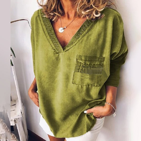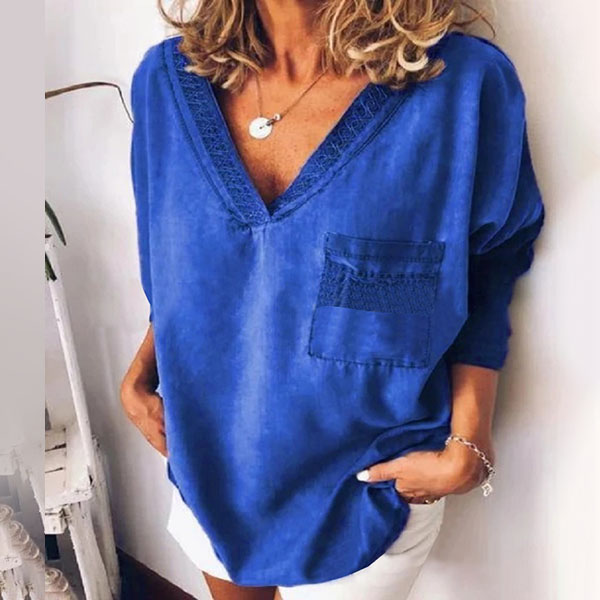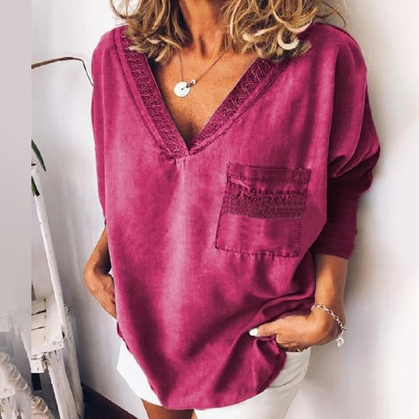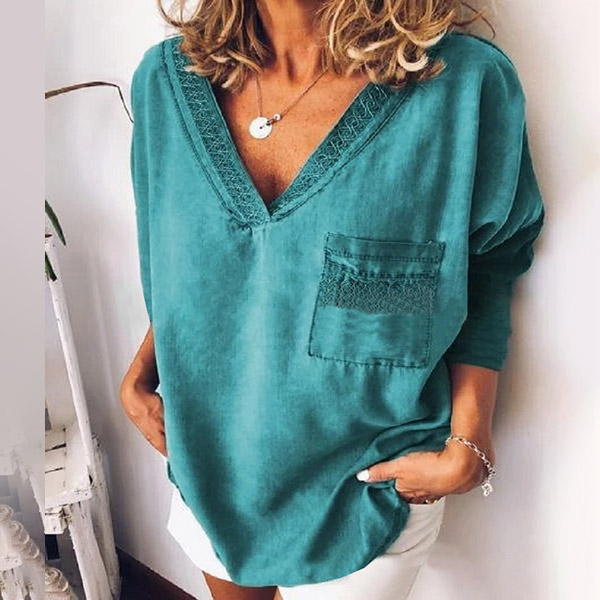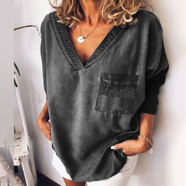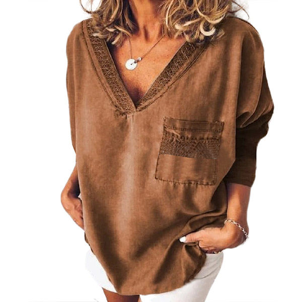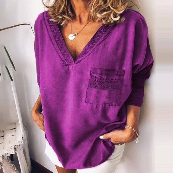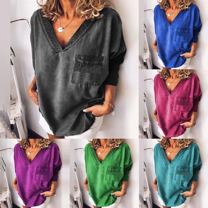 This t-shirt boasts a solid color,crafted from soft and breathable fabric,with long sleeve and a loose silhouette design,which can give you a comfortable day,while the v-neck,chest patch pocket and lace spliced details will boost its charm. For your casual weekends,this relaxed piece is really a perfect choice.