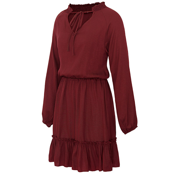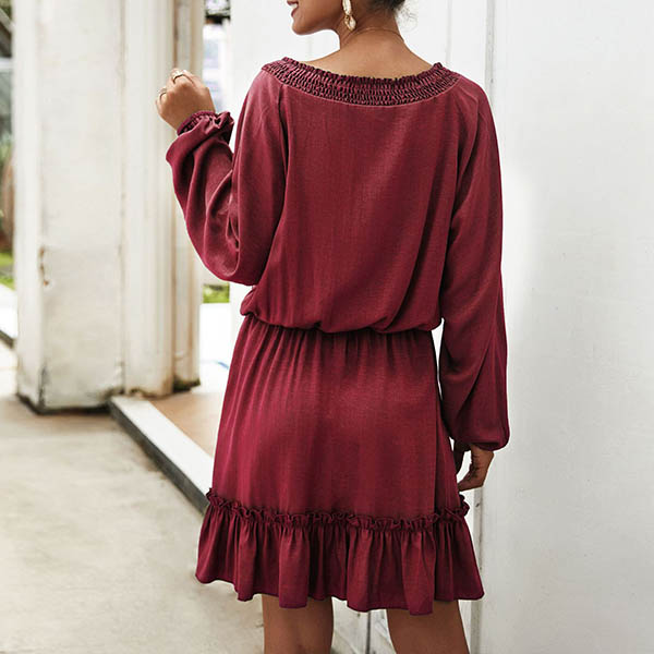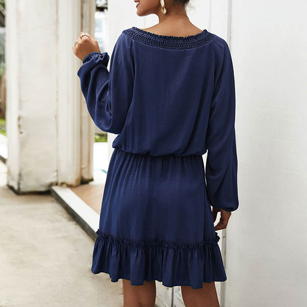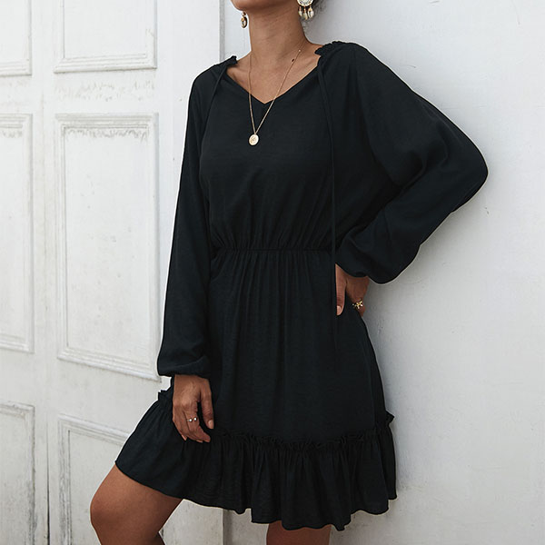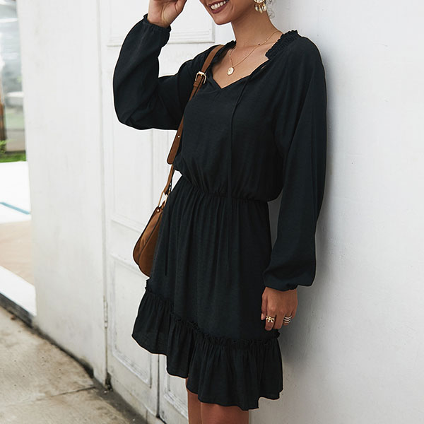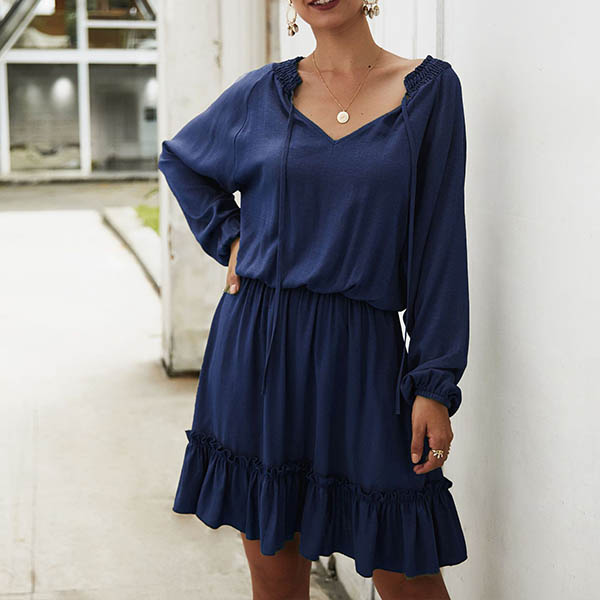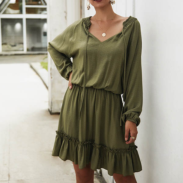 Fashion Solid Color Long Sleeve V-neck Ruffle Hem Dress