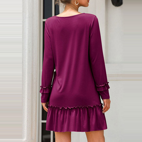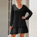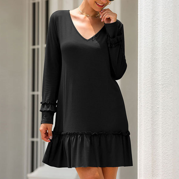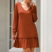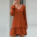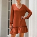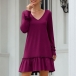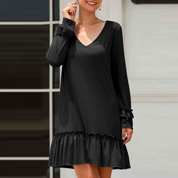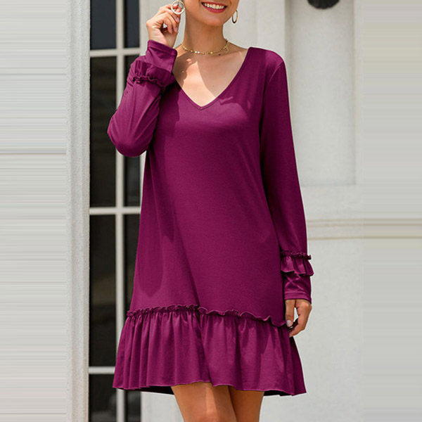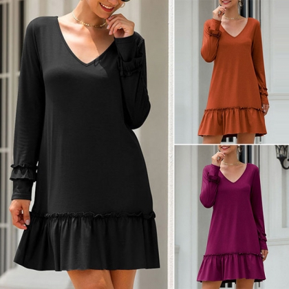Fashion Solid Color Long Sleeve V-neck Ruffle Hem Loose Dress