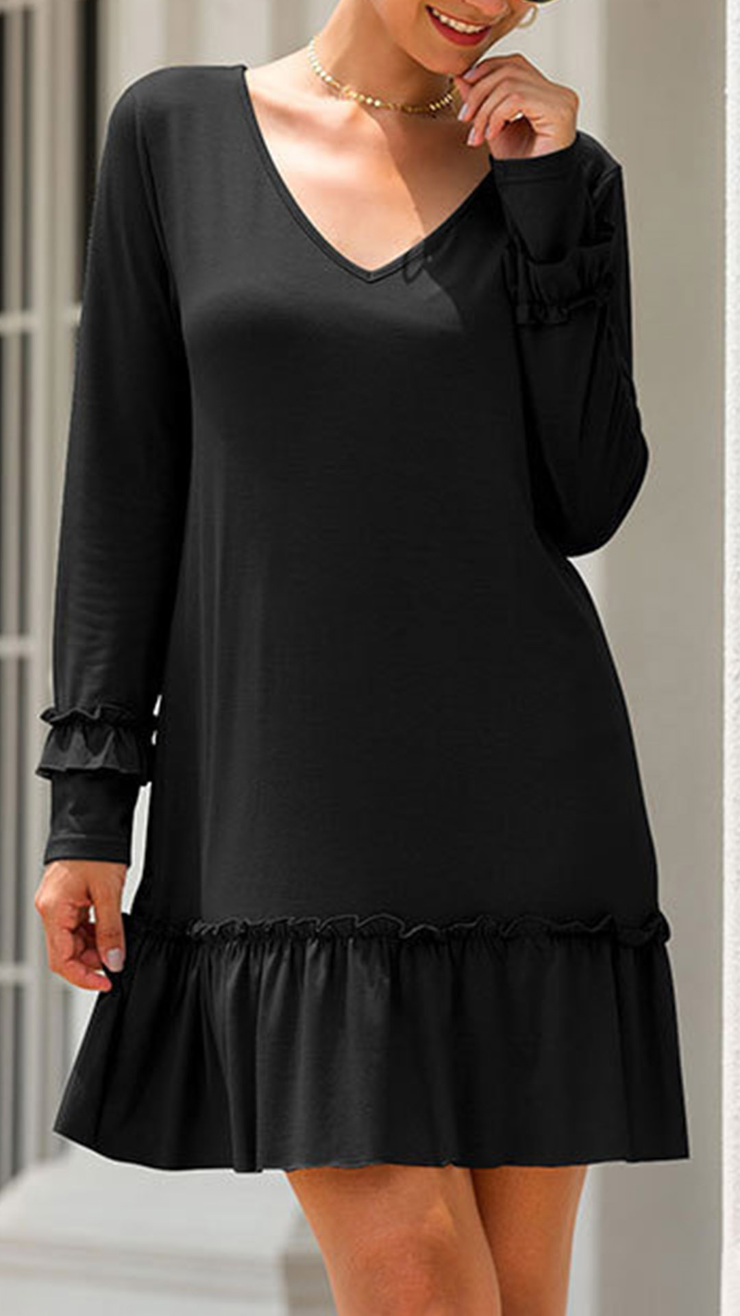 A perfect combination of sassy,sweet vibes,this dress can easily strike your mind. Solid color style,the v-neck and ruffle hem design will make this piece look more stylish and attractive. Crafted from soft and breathable fabric,with long sleeve and a loose silhouette,this dress can give you an easy transition from busy workdays to casual weekends.