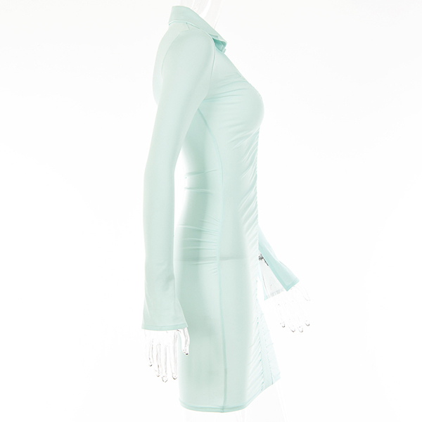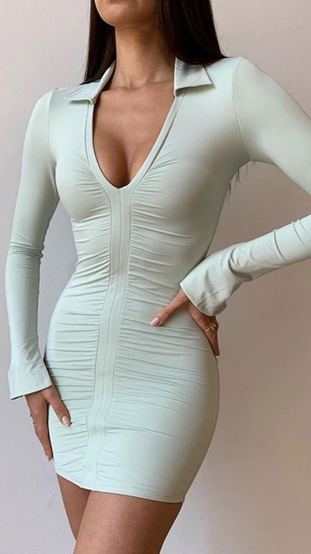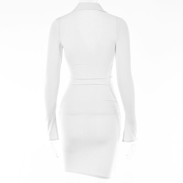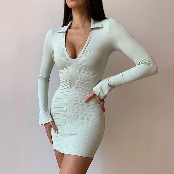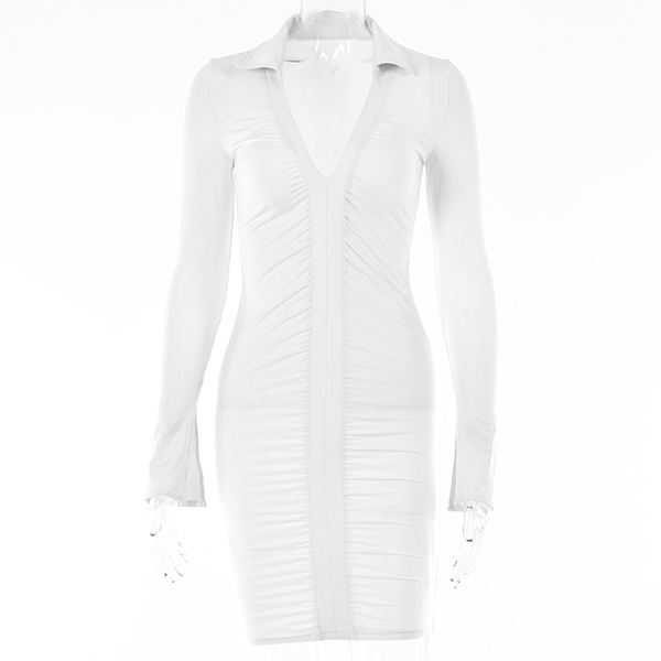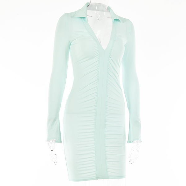 Fashion Solid Color Long Sleeve V-neck Slim Fit Wrinkled Dress