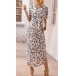Fashion Solid Color Long Sleeve V-neck Slit Hem Leopard Printed Calf-length Dress