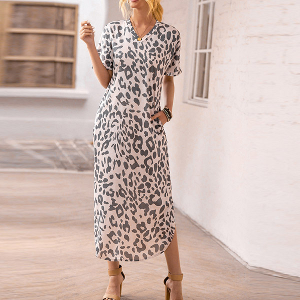 When you go out with this dress,you can easily win more eyes. The leopard printed details make this piece look so stylish and eye-catching. Finished with short sleeve,v-neck,slit hem and a loose silhouette,this dress is sure to know how to give you a cozy yet stylish style.