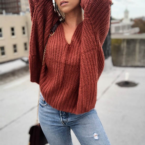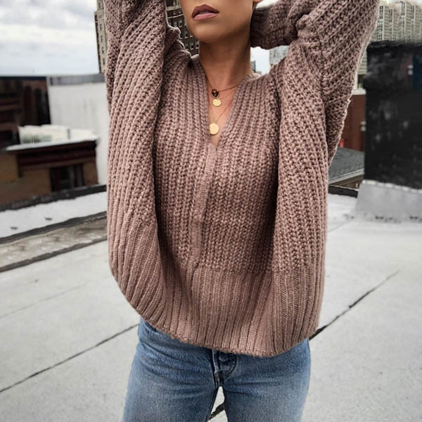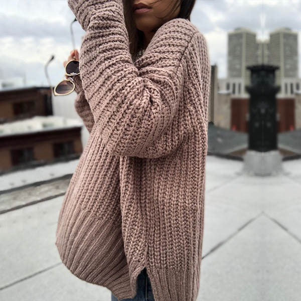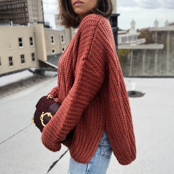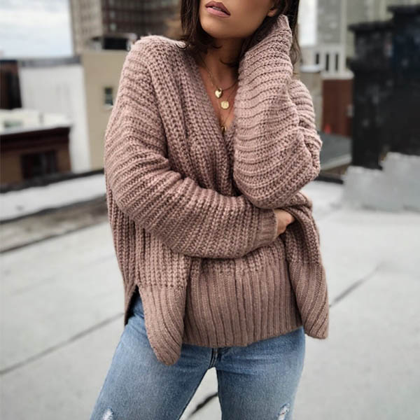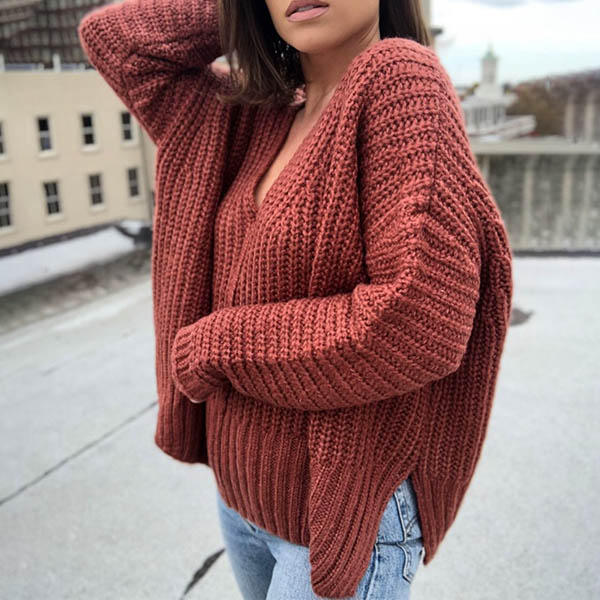 Fashion Solid Color Long Sleeve V-neck Slit Hem Loose Sweater